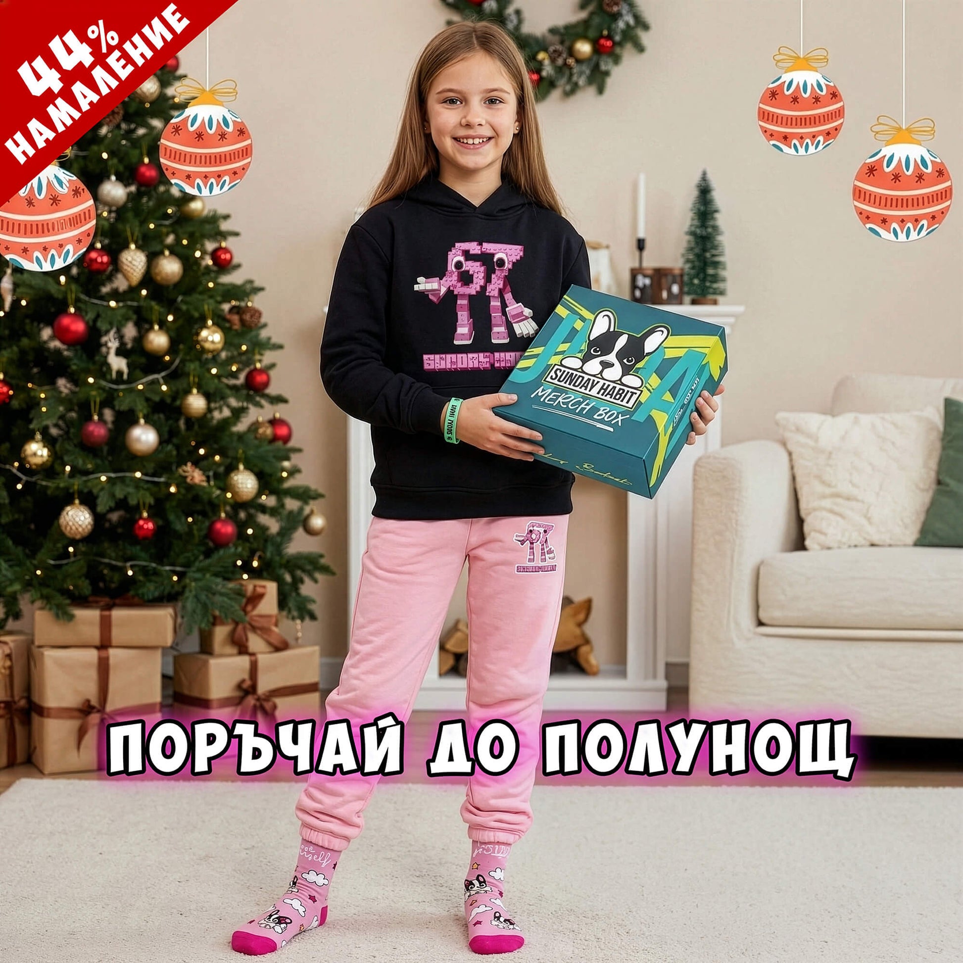 Комплектът включва удобен суичър и меко долнище в розова гама, розови чорапи и светеща гривна, която добавя забавен и магически акцент. Всичко е поднесено в красива коледна кутия, готова за подаряване.